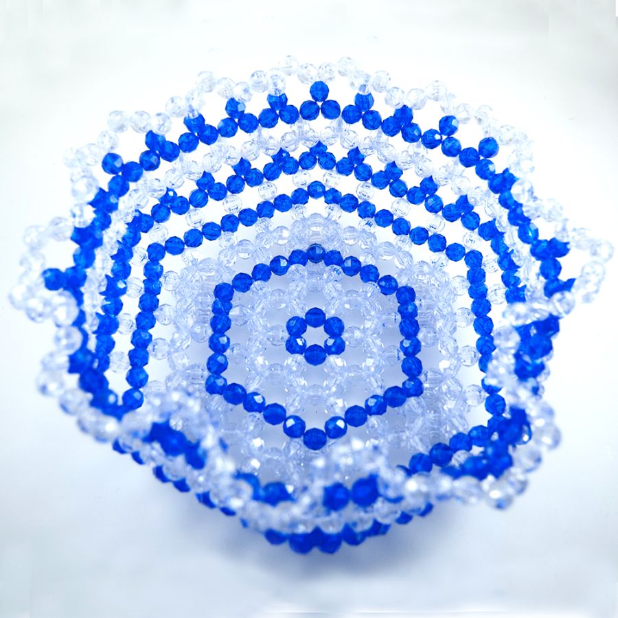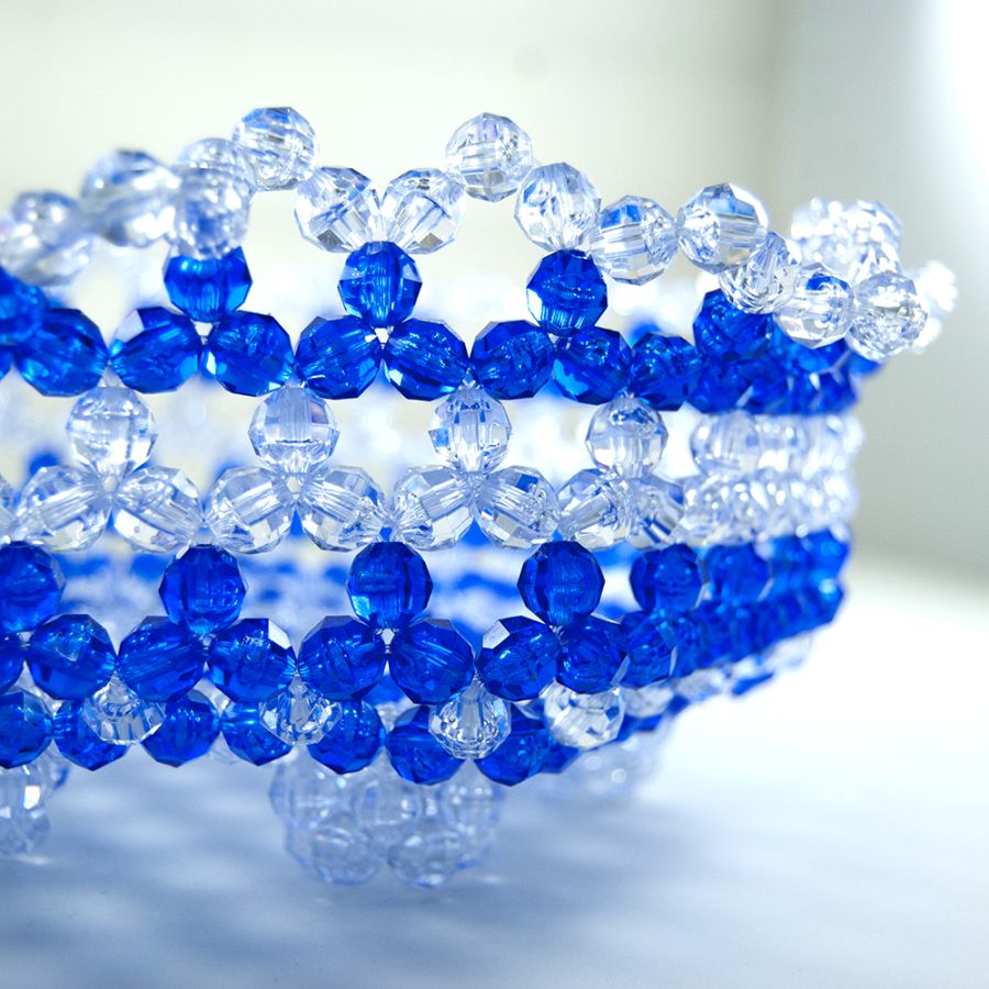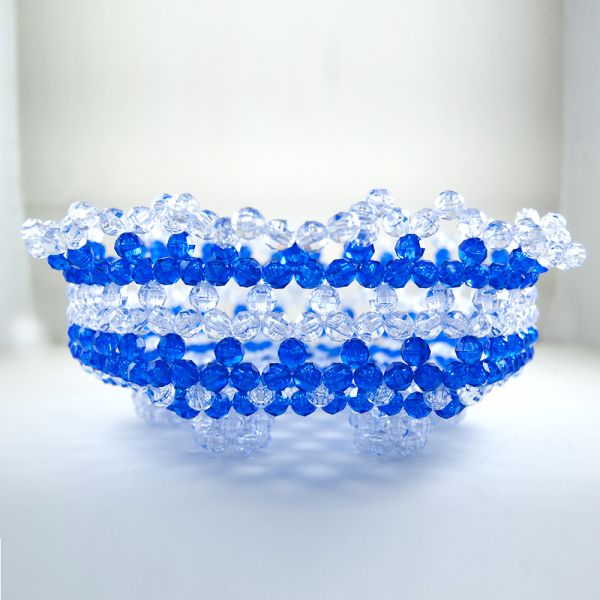 Blue and white striped woven fruit bowl made out of transparent faceted beads.