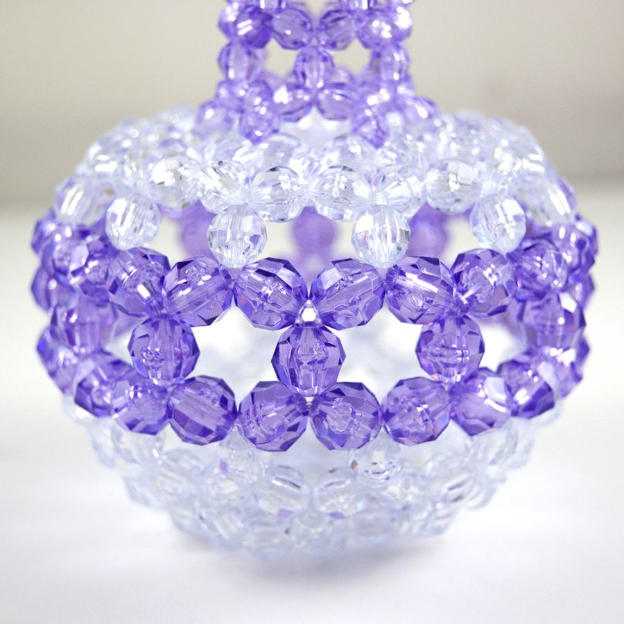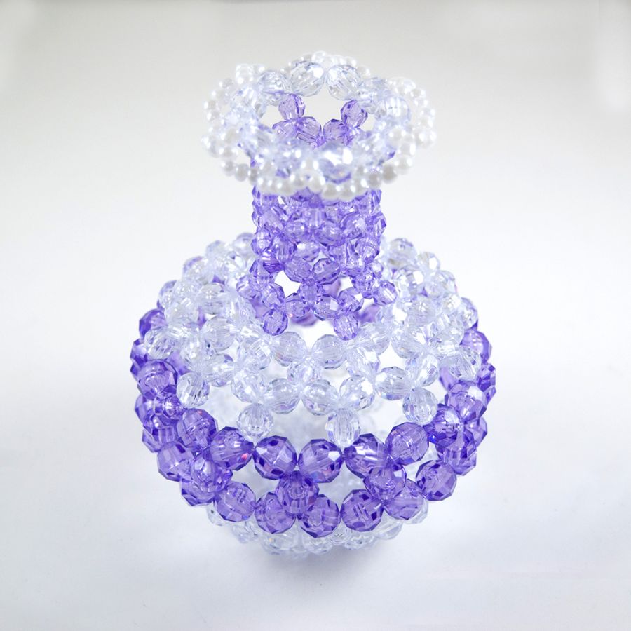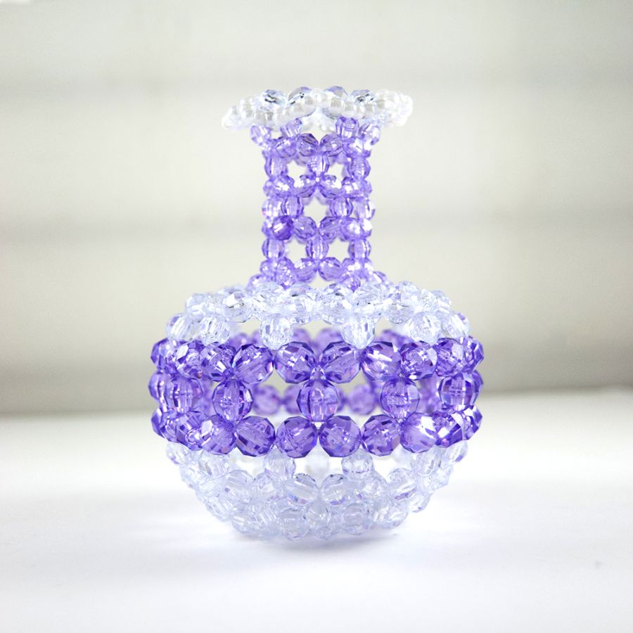 Small handmade vase made of woven transparent purple and clear acrylic faceted beads.