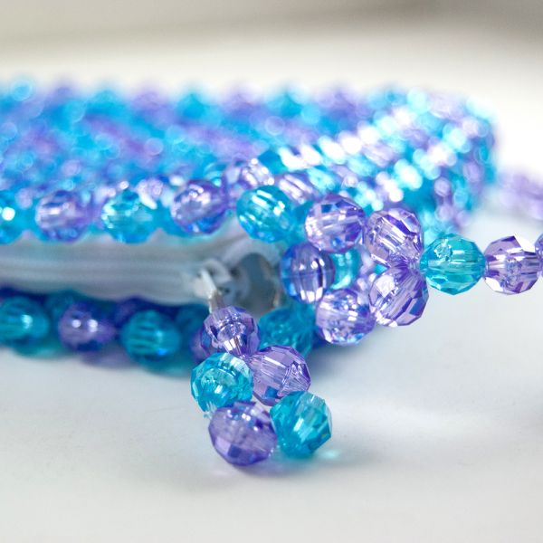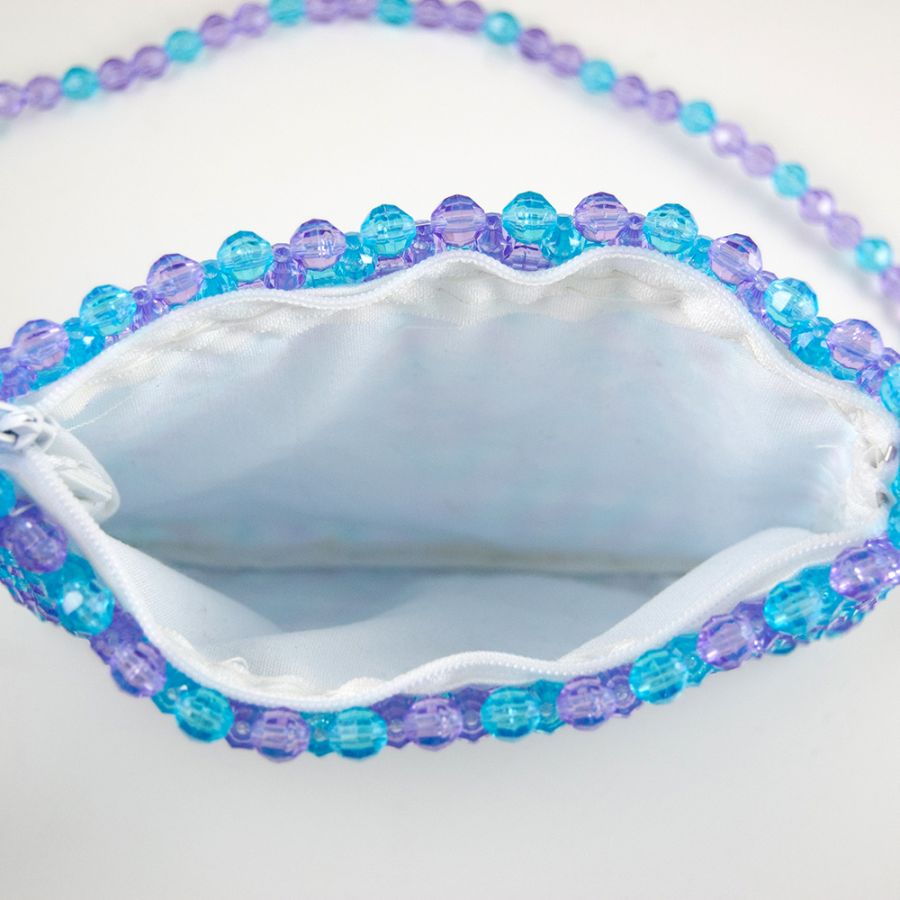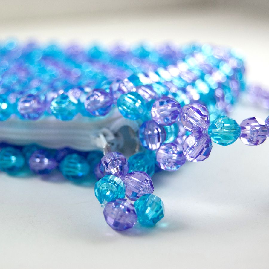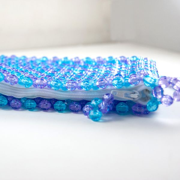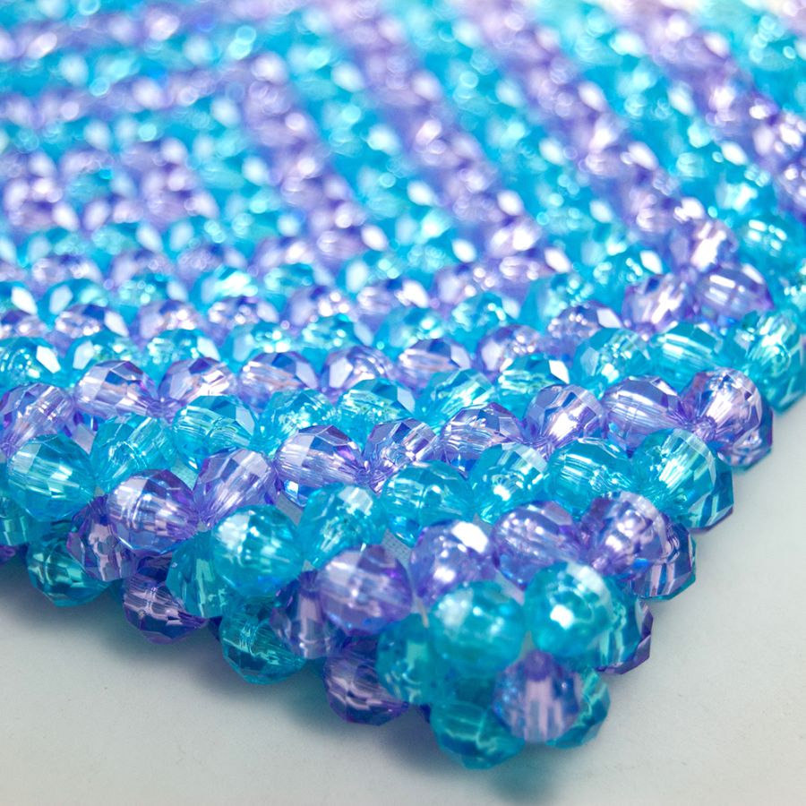 Handmade purse made of woven transparent blue and purple acrylic faceted beads.