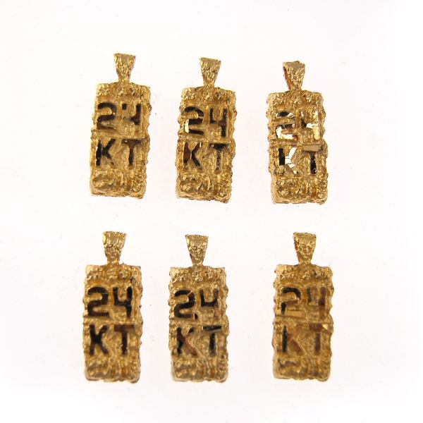 Vintage Charms "24 KT" Gold Plated **Not Real Gold** - 6pcs These charms were made in the 1980s. The quality of the gold plating is very high quality. Pendant/Charm measures approx.1-1/4in (31mm) tall and 1/2in (12.5mm) wide **Limited